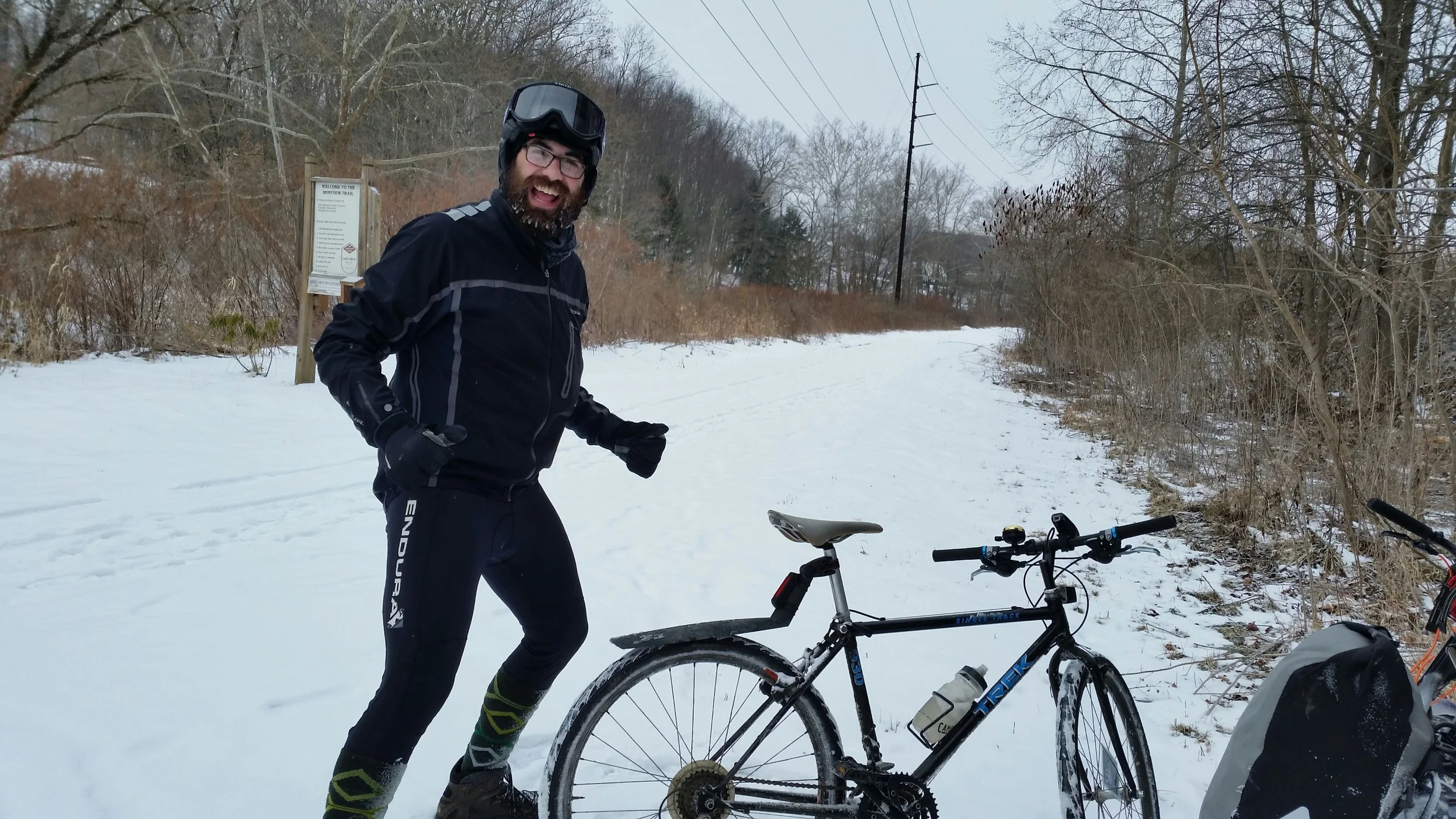 Because of the cold weather and recent snow we decided it would be best to ride through the west end and take a more tarmac and traffic heavy route where in nicer conditions we would have most likely pedaled through McKees Rocks and Neville Island to Coraopolis to catch the head of the Montour Trail. You can check out our route via google maps here . Fortunately we were able to get up and over the West End without too much static from morning traffic. As expected the Montour Trail was snow covered with very minimal tracks. There was one set of fat bike tracks in the snow that both Katharine and myself attempted to follow without too much success. This 10 or so miles was definitely the most challenging part of our ride and did cause a fair bit of anxiety about missing our flight due to our slow than expected pace. It also began to snow at a fairly heavy rate for the last 5 miles or so. In retrospect these challenges were the best part of the ride. The snow was beautiful and really made the ride special. We also saw a coyote clear as day right on the Airport connecting trail which was really cool.